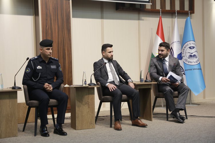 The seminar was held in the presence of Prof. Dr. Hoger Taher Tawfiq, Vice President of Nawroz University for Administrative, Financial, and Student Affairs, along with college deans, faculty members, and students, and was organized in coordination with the General Directorate of Social Welfare, the General Directorate of Traffic in Duhok Governorate, the Duhok Customs Directorate, and the Bahdinan Institute (NGO).