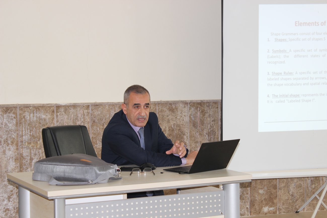(17/11/2019) رتبت سميناراً لكافة اساتذة القسم و الكلية من طرف (پ.د. على حيدر سعد )تحت اسم وعنوان (THE GENERATION OF RIFAAT AL-CHADERCHI FACADES USING STANDARD SHAPE GRAMMARS).