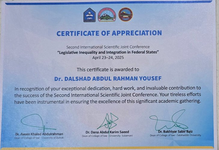 On Wednesday, April 23, 2025, Prof. Dr. Dilshad Abdulrahman Yousif, Dean of the College of Law and Politics at Nawroz University, participated in the Second International Scientific Conference of Legal Departments in the universities of Duhok, Salahaddin, and Sulaimani.