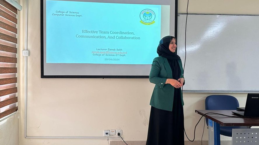 في يوم الخميس الموافق 6/5/2024، قدّمت الأستاذة (زينب صالح عجيد) محاضرة علمية في كلية العلوم بجامعة نوروز تحت عنوان (Effective Team Coordination, Communication, And Collaboration) حيث تم عرض استراتيجيات تعزيز العمل الجماعي والإدارة الناجحة.